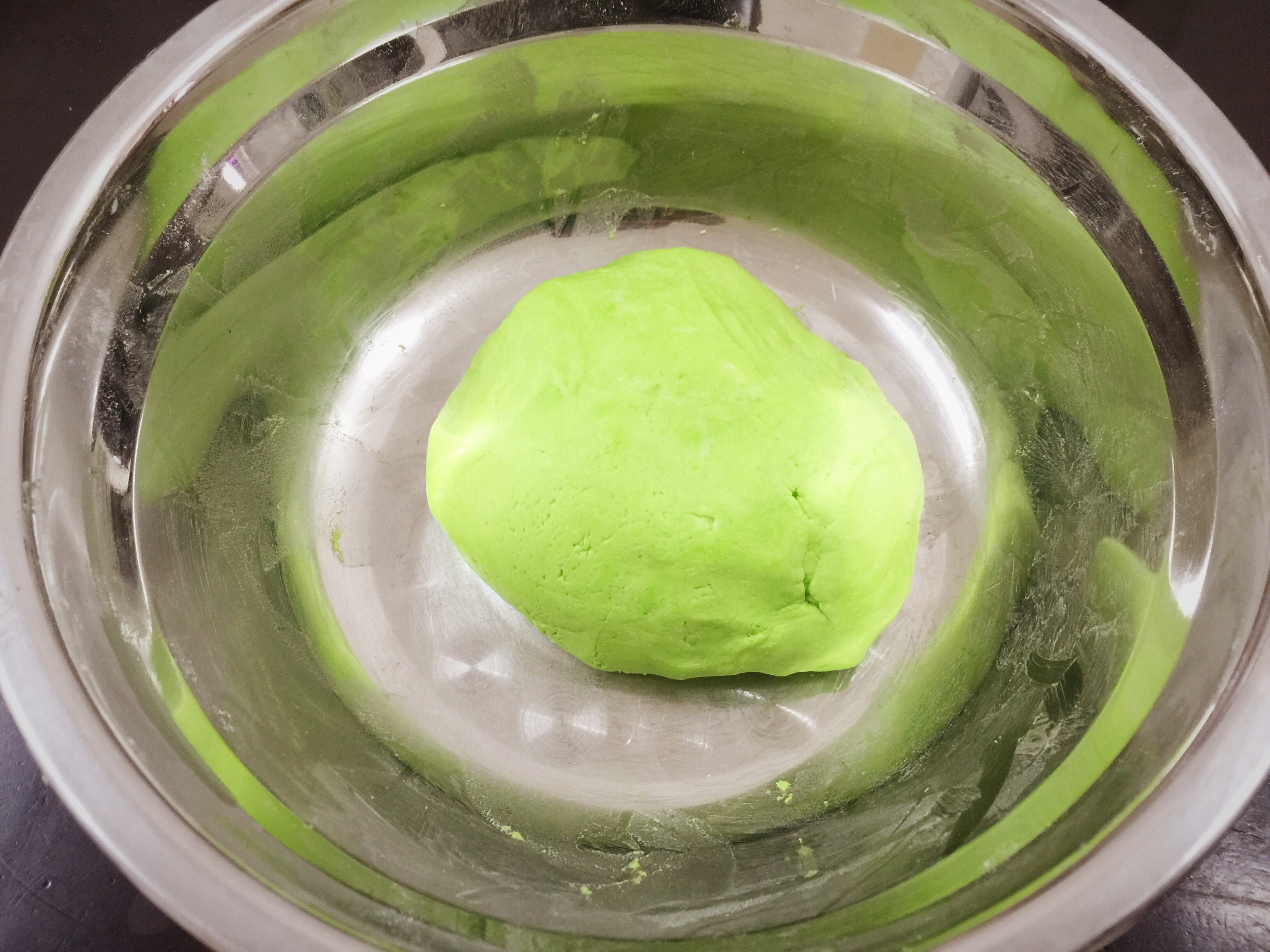 - Masukkan pewarna hijau ke dalam air pandan dan masukkan air ini ke dalam tepung sedikit demi sedikit sambil menguli.