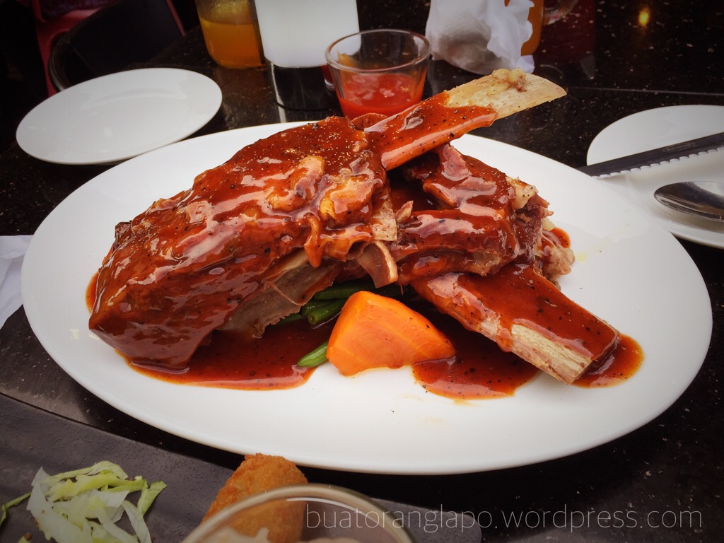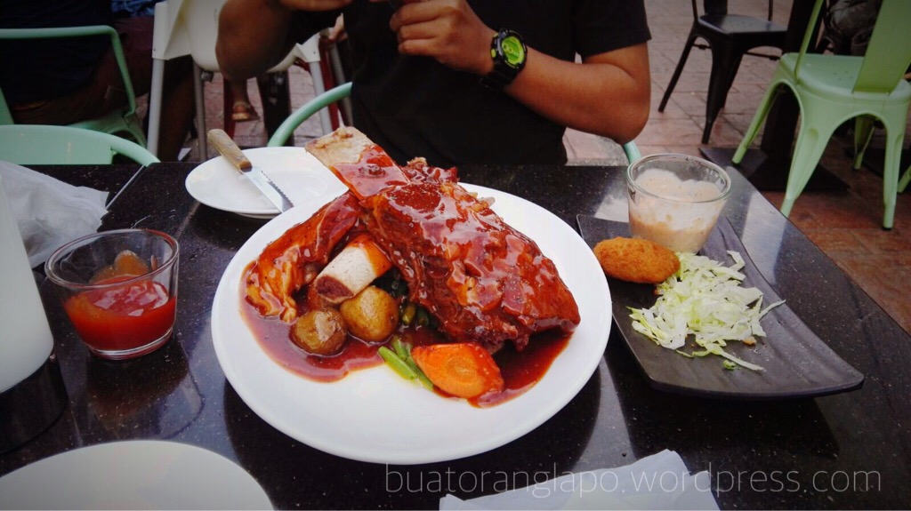 Kat sini aku nak citer pasal satu menu dia yg aku rasa memang terbaek lah. Portion dia memang banyak gile, siap pelayan dia bagitau awal2 lagi yg portion dia ni memang banyak dan selalunya customer dia memang takkan habis makan, kene tapau bawak balik. Menu yg aku cakap tu nama dia Badoque Ribs (Tender beef ribs glazed in our homemade BBQ sauce) ha tu penerangan menu dia lah. aku copy paste je dari menu dia. Harga dia dalam $36 (Singapore Dollar) kalau convert ke RM dalam RM108.75 (ikut current rate. google je la). Bapak mahal gile, nasib baik bos aku yg bayar. kalau aku memang tak la nak keluar duit sendiri.