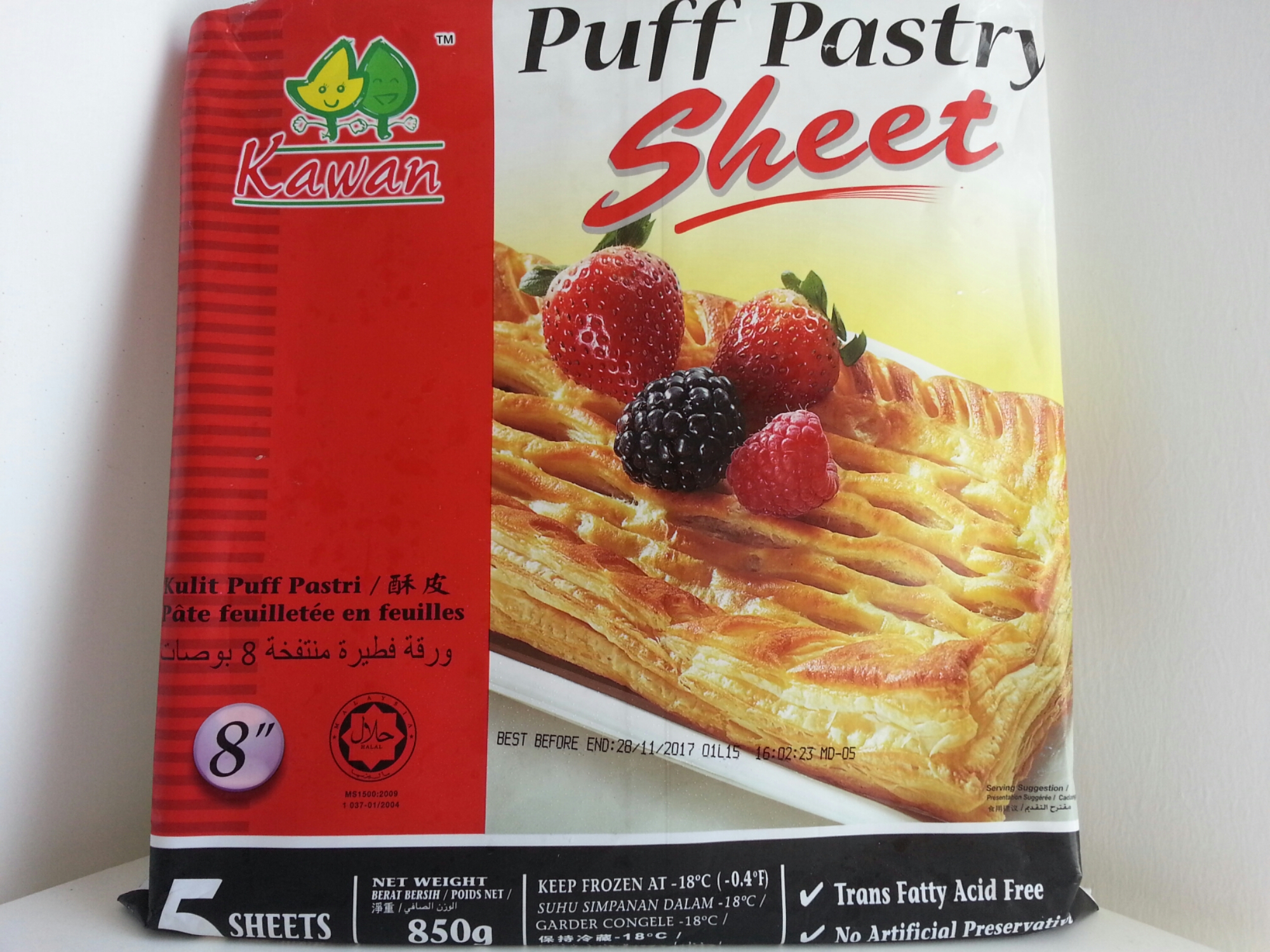 Ha ni puff pastry yang saya guna. Jenama kawan. Ada 5 keping kat dalam ni. Bentuk dia segi empat sama. 1 keping tu boleh potong 2. So boleh la dapat 10 puff. Makan 1 pun dah kenyang sebab besar. Ok jom kita tengok resepinya…