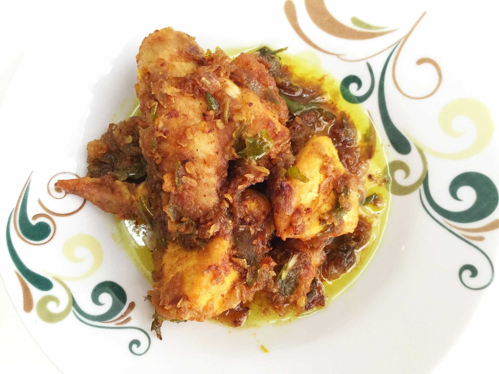- Gaulkan ayam dengan garam dan serbuk kunyit. Goreng sehingga masak. Ketepikan.