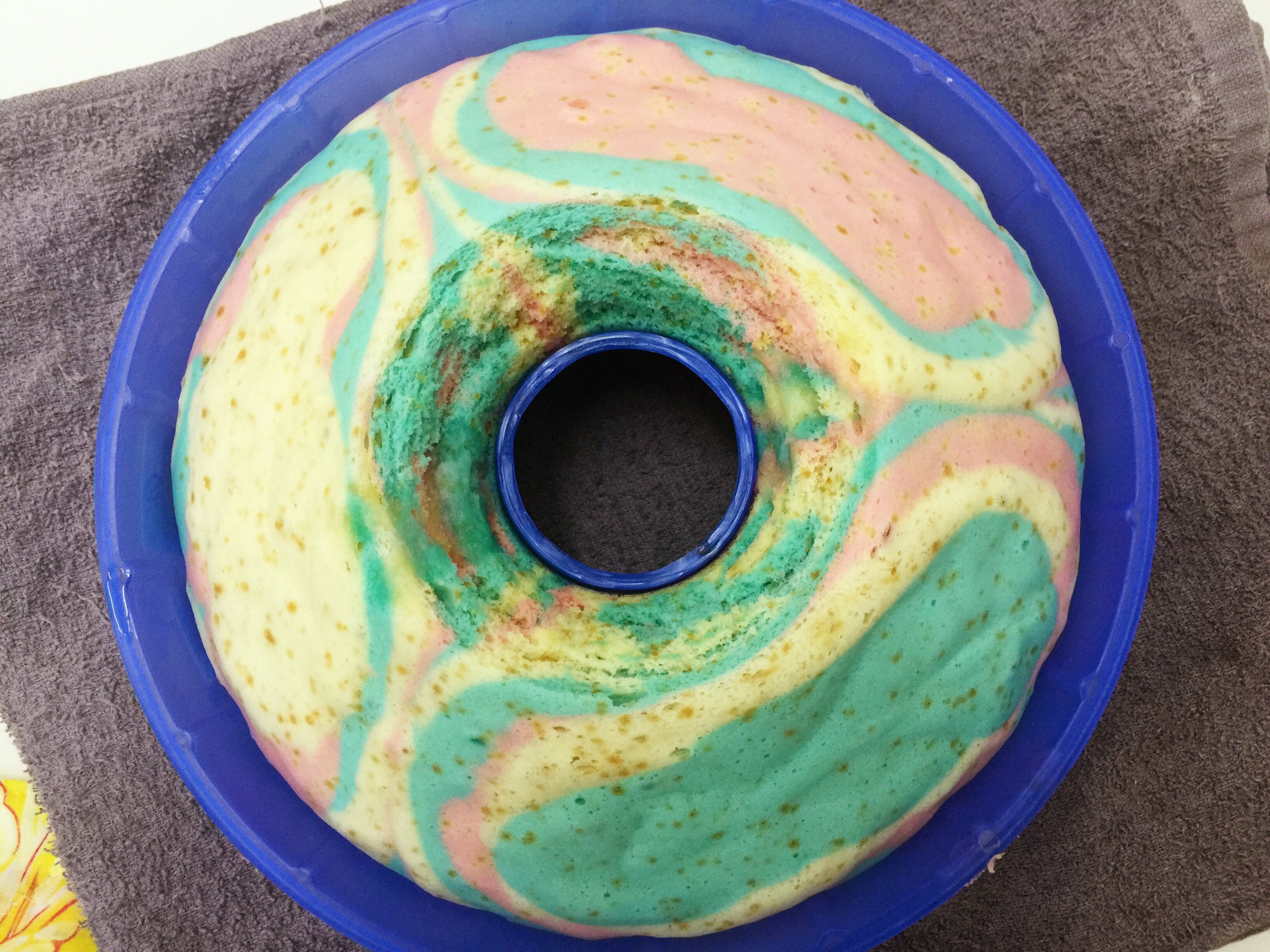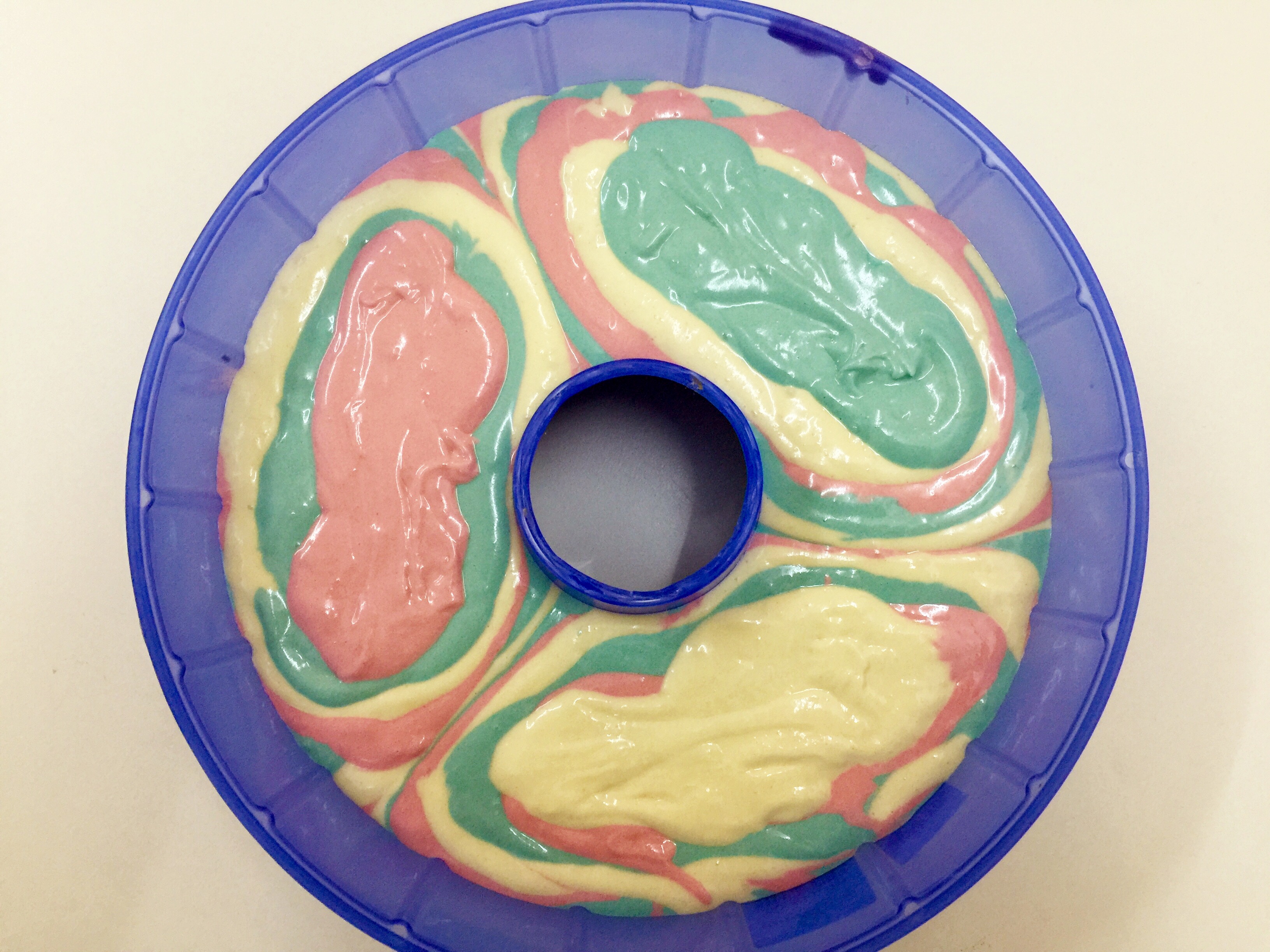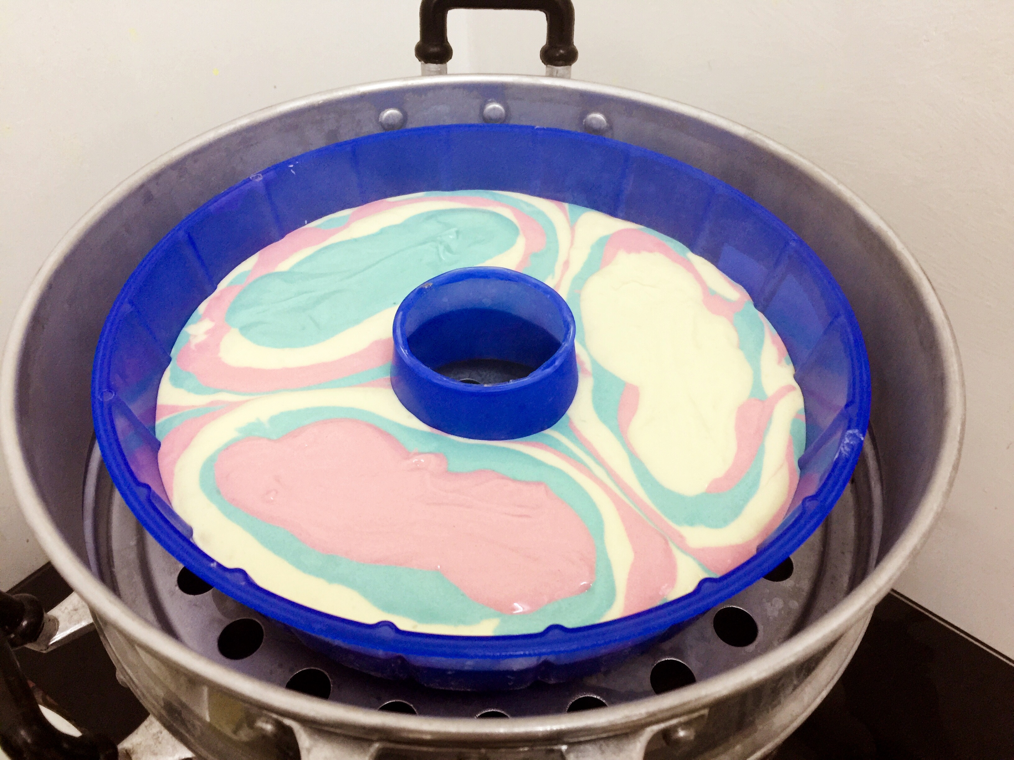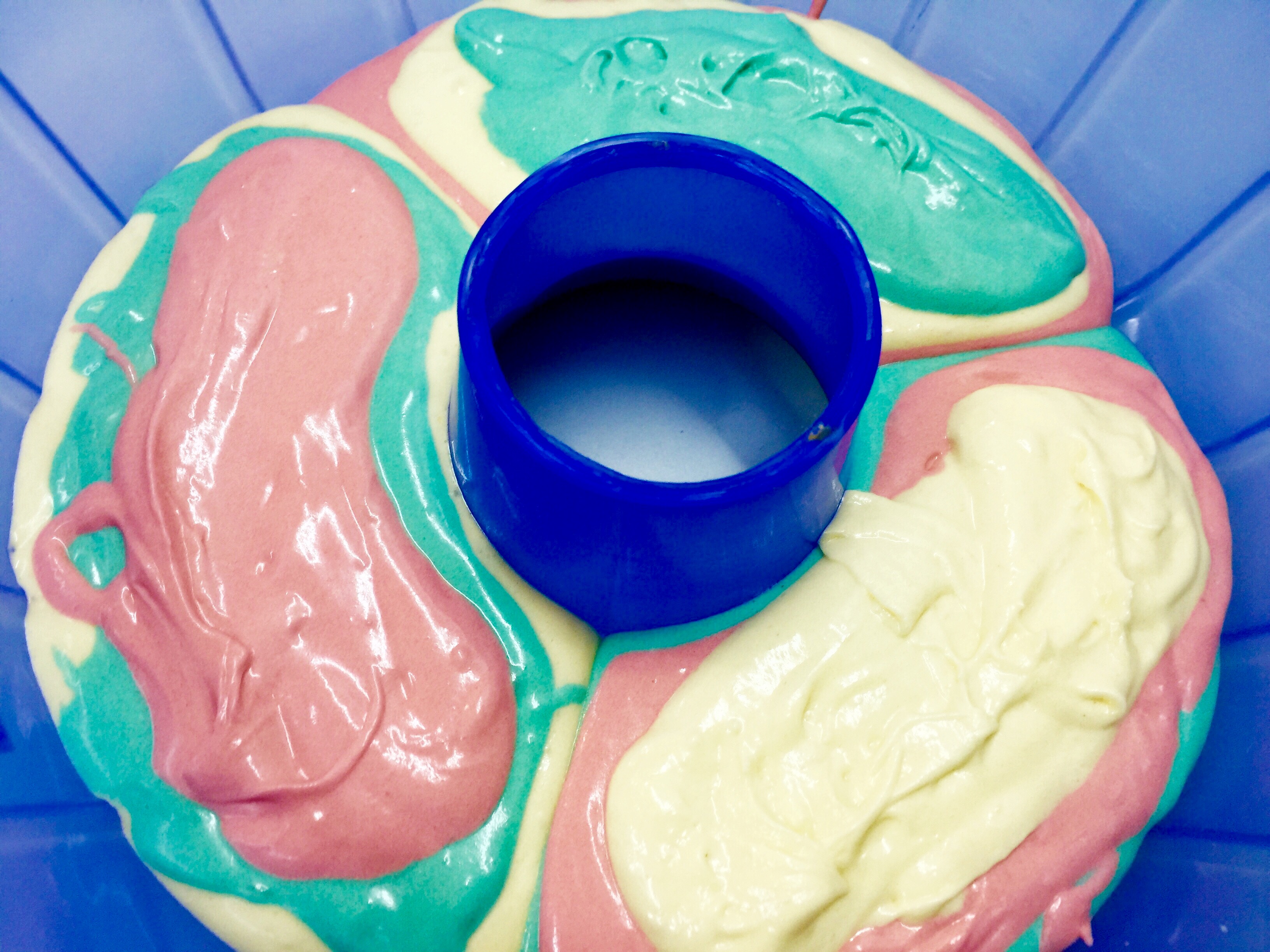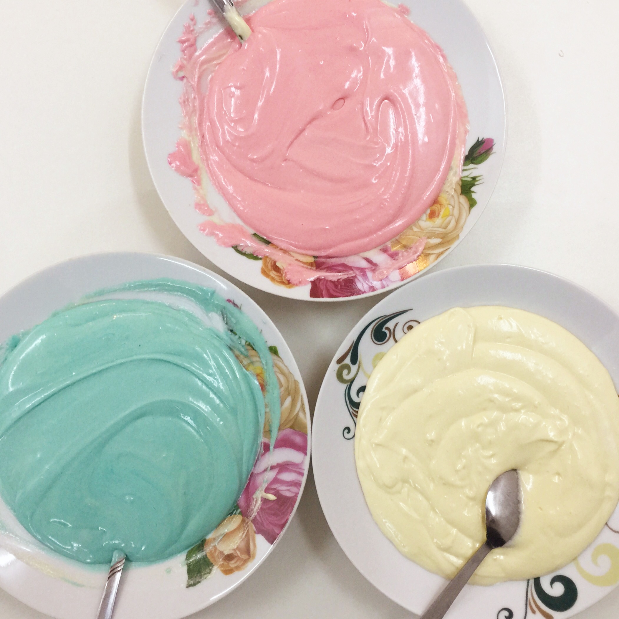 - Bahagikan adunan kepada beberapa bahagian. Campurkan dengan warna kesukaan masing2. Saya bahagikan 3 bahagian. Letak warna biru dan pink. 1 bahagian lagi tak letak warna. Putih je.
