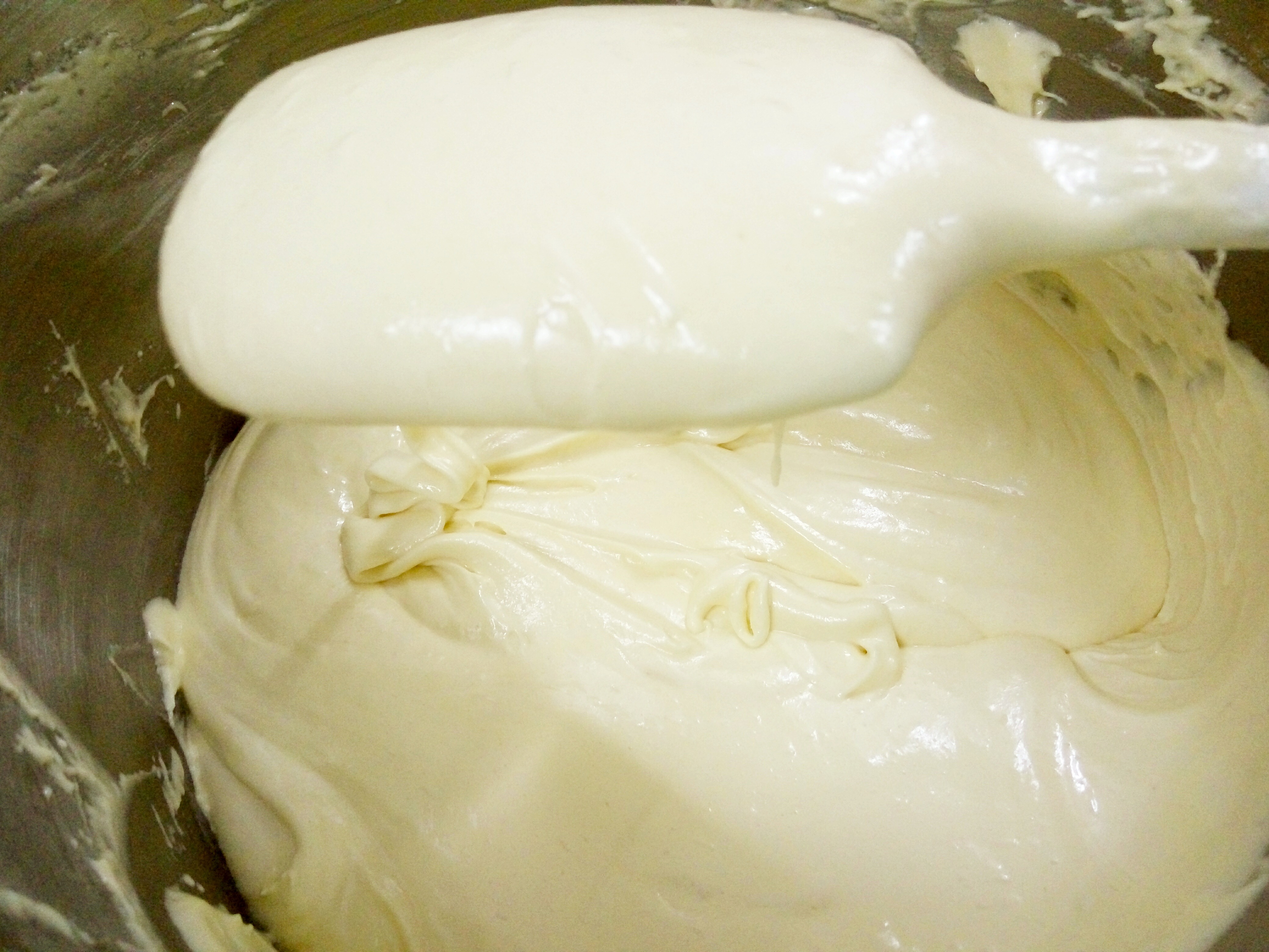 - Masukkan tepung gandum sedikit demi sedikit dengan kaedah kaup balik menggunakan spatula sehingga sebati.